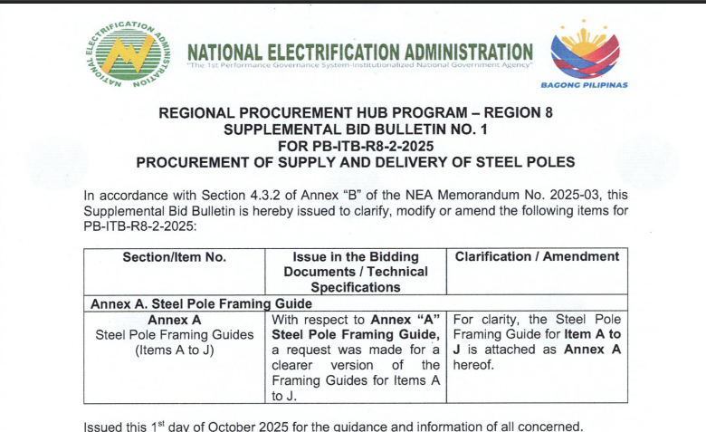 In accordance with Section 4.3.2 of Annex “B” of NEA Memorandum No. 2025-03, this Supplemental Bid Bulletin is hereby issued to clarify, modify or amend the following items for PB-ITB-R8-2-2025.