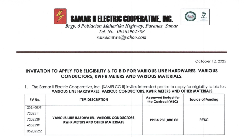 INVITATION TO APPLY FOR ELIGIBILITY & TO BID FOR VARIOUS LINE HARDWARES, VARIOUS CONDUCTORS, KWHR METERS AND VARIOUS MATERIALS