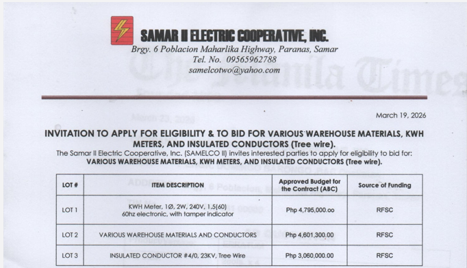 Invitation TO Apply for Eligibility & to Bid for Various Warehouse Materials, Kwh Meters and Insulate Conductors(Tree wire) Posted on March 23, 2026